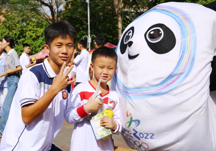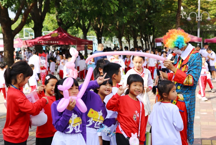 为了吸引更多的顾客,同学们或身穿漂亮的汉服撑着油纸伞,或cos成各类动漫人物,或扮成可爱的冰墩墩、小黄鸭,“走街串巷”兜售商品。“我是自学的制作气球小狗,小朋友们很喜欢,一个一只的气球小狗30秒就可以制作完成。”八年级敬源基同学扮成小丑模样,面前排着长队等待可爱的气球小狗。初中部郑嘉豪同学是第4年参加爱心商会,他说,从小学到初中一直都有参与爱心商会活动,每年都特别期待,在买到中意商品的同时也献出了爱心,非常有意义。