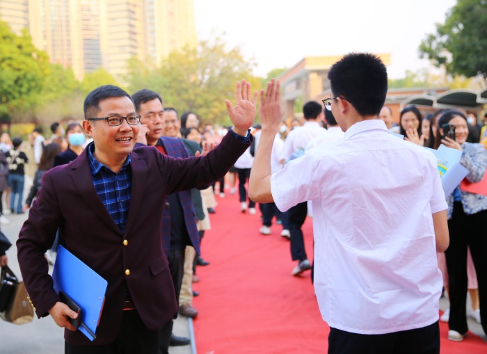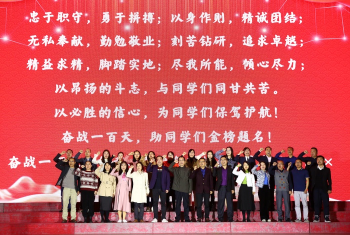 为鼓舞高三年级全体师生的斗志,卓雅外校校长谢柏祥将“高考必胜”旗帜授予高三年级,高三年级级长熊四鹏挥舞旗帜,与全体师生高呼“高考必胜!高三加油!”谢柏祥与全体高三教师走上主席台,紧握右拳,郑重宣誓,表达卓雅外校老师对学子们期望。