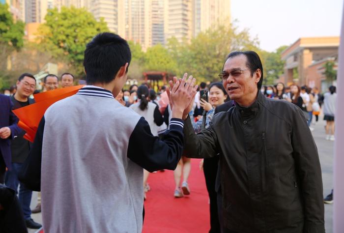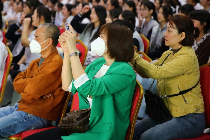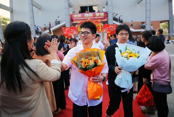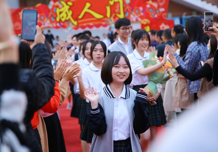 仪式上,同学们观看了高三年级精心制作的成人礼视频《成长的足迹》,高三年级的老师以及家长代表也录制了视频,将满满的祝福送给高三的学子们,高三年级的同学们也倾情朗诵诗歌,表达对父母、老师的感谢。“今天非常感动,看到孩子成长的点滴,看到老师们对孩子们的爱,心里暖暖的。”高三(4)班刘杰的妈妈在活动过程中笑得合不拢嘴,为刘杰的长大成人感到高兴,也对他的未来充满希望。高三(3)班林浩权的爸爸妈妈捧着煲好的排骨汤来参加孩子的成人礼,希望他能尝到家的味道,感受到爸爸妈妈对他的支持。高三(6)班王枝音的妈妈忙前忙后帮孩子拍照,记录下每一个非常有意义的瞬间,她说,孩子的成长源于父母的不断支持和老师的谆谆教诲,看到她步入成年人的世界,心情喜忧参半,希望她在遇到困难时,不气馁不退缩,勇敢迈向充满未知而又精彩的人生。