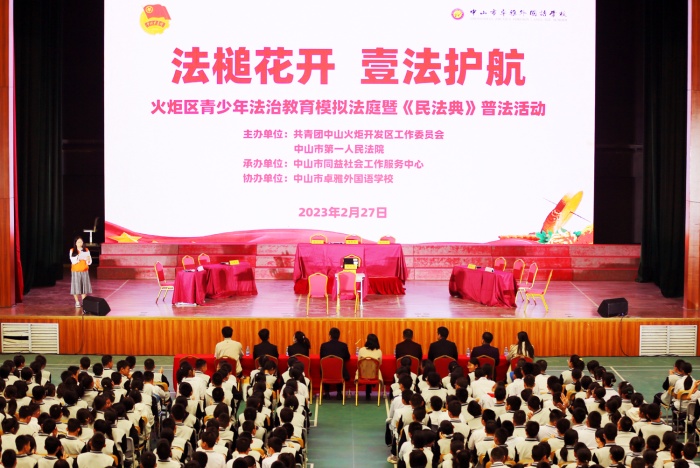 本次活动由共青团中山火炬开发区工作委员会、中山市第一人民法院主办,中山市同益社会工作服务中心承办,中山市卓雅外国语学校协办。火炬开发区团工委书记高颖、中山市第一人民法院火炬开发区人民法庭副庭长邓文辉、卓雅外校副校长李文、毕文龙等参加模拟法庭活动。