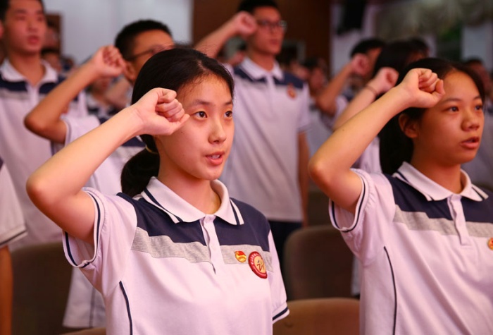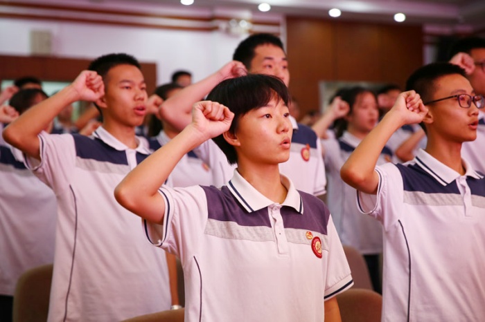 “我自愿加入中国共产主义青年团,坚决拥护中国共产党的领导,遵守团的章程,执行团的决议,履行团员义务,严守团的纪律……”入团仪式上,新老队员面向团徽,紧握右拳庄严宣誓,44名同学正式加入中国共产主义青年团。