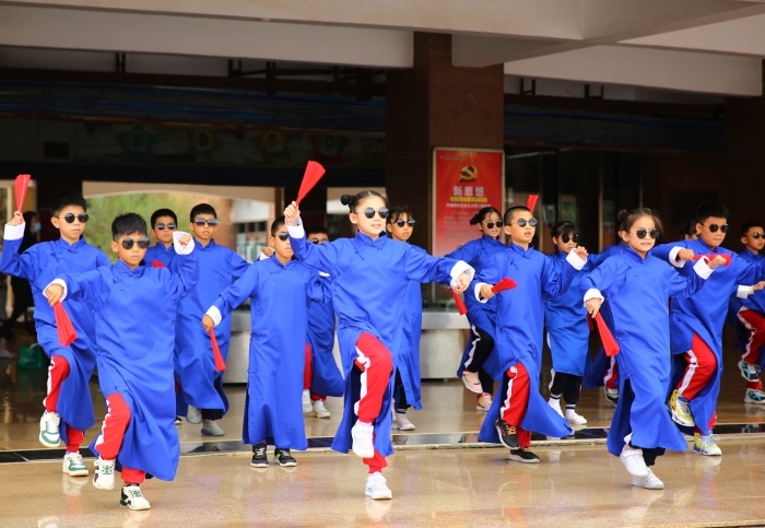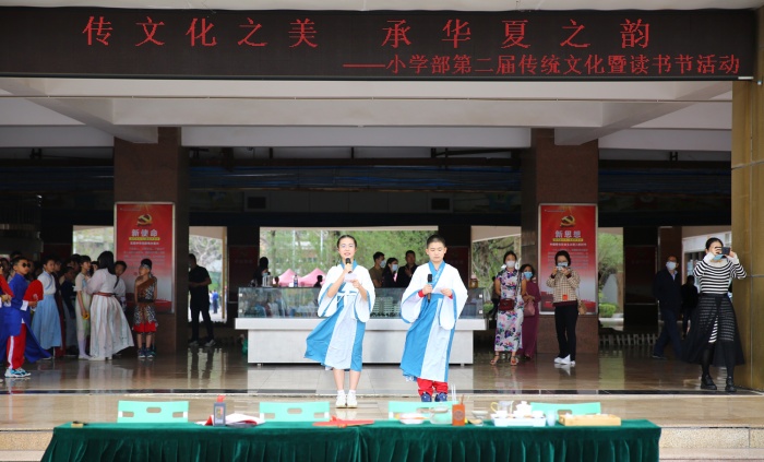 大课间,家长们来到操场,观看“课外阅读校本课程成果展示”,同学们身着汉服盛装出席,手持折扇风度翩翩,以情景剧、歌舞表演、手语操、诗歌朗诵等形式,再现西游记、千字文、鲁滨逊漂流记等中外名著名篇的精彩内容,小学部还邀请家长身着传统服饰参与到茶艺表演中,与同学们一起感受优秀的中国传统文化。