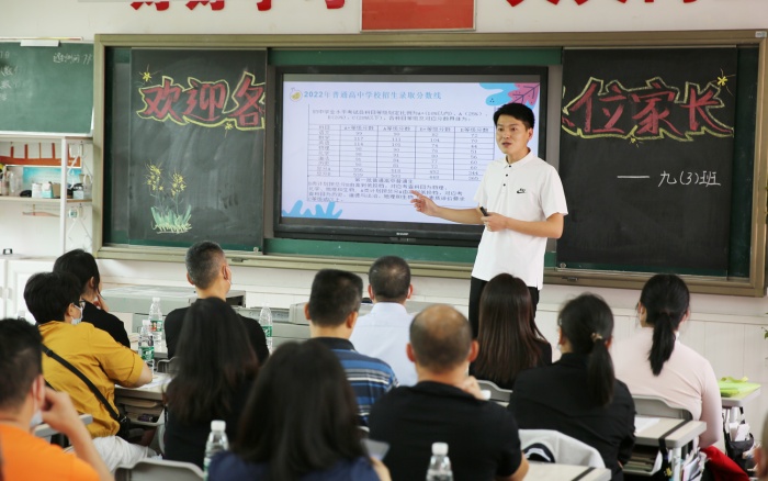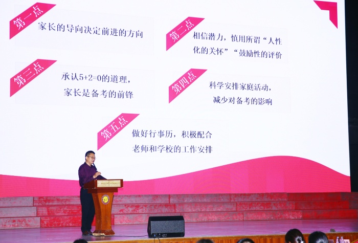 初中部校长李文以“百日之战协作才能共赢”为题讲话。他指出,家长的导向能够决定学生前进的方向,家长要相信孩子的潜能,成为中考备考的“前锋”,在学生时间管理、周末时间安排上,切实做到以学生学习为中心,安排好中考前的家庭行事例,多关心、陪伴、鼓励孩子,积极配合好学校和老师的各项工作安排,真正做到家校共育,打赢中考攻坚战。