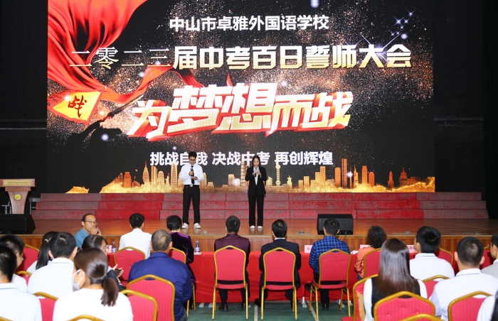 百日冲刺下战书,宣誓立志战中考,3月17、18日,初中部举行八、九年级中考百日誓师大会,活动现场,同学们手拿“生地必胜”“不负芳华、迎战中考”“沉着冷静”等字样的手举牌,佩戴“学业有成”锦囊,为自己加油打气,在老师和家长的鼓励见证下,向100天后的中考发起冲刺。