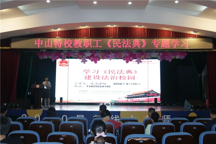 为深入宣传和学习《中华人民共和国民法典》,营造普法、知法、学法、守法、用法的浓厚氛围,进一步提高教师学法、懂法、用法的法治意识,9月25日下午,中山特校邀请广东金桥百信(中山)律师事务所张龙律师来校,面向全体教师开展《民法典》专题解读普法讲座。