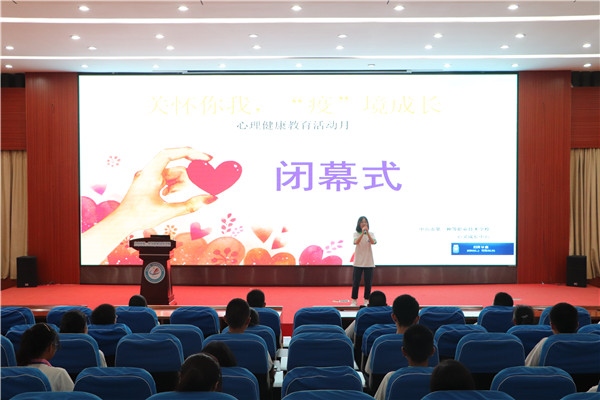 在闭幕式上,社工小鱼姐姐为心理委员做“阿Q说”的暖场活动,随着活动的进行,现场氛围活跃起来。学校心灵成长中心闻明老师总结活动开展情况:本次心理健康教育活动月在学校、学部两个层面进行,面对学生、家长、教师三个群体,共开展了32项活动;本次活动覆盖面广,参与度高,实效性强,实现了全员育人、全程育人、全方位育人;活动内容多层次,内涵丰富,如返校前教师心理教育培训、心理健康教育活动月开幕式、复学适应讲座、音乐心理辅导工作坊、心理健康普查、心理教师家访、云南生团体辅导、短视频制作比赛、心理健康黑板报比赛、校园歌手大赛等活动。全校师生全员参与活动,体现出一职校学生阳光积极的生活态度。大会还对“微关怀,大成长”校园短视频创作的主题特色心理健康教育活动中得奖的选手进行颁奖,鼓励全校师生积极创作阳光正面的视频,其中18数媒班何嘉杰的《梦》等13个作品荣获一等奖,18食品1的 《少年》等19个作品荣获二等奖,17灯具3班张桢的《以梦为马,不负韶华》等35个作品荣获三等奖,同时也现场展示了荣获一等奖的作品,感受同龄人的创作激情和正能量。现场还邀请到18分析的三位晋级歌手现场演唱,为即将到来的校园歌手大赛进行预热。