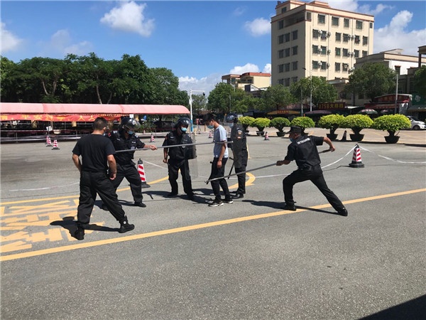演练前,指导教官对整个演练流程进行了讲解。演练开始,两名“滋事者”手持器械,到校门口跟值班保安交涉,情绪激动,时不时挥动手中的器械向保安挑衅,想强行闯进学校。值班保安手持钢叉、盾牌、警棍进行防备,进行劝退,同时马上汇报保安队长并调动各岗位人手到现场,并启动一键报警按钮和汇报学校值日行政。面对“滋事者”,保安员果断出击,大声警告喊出:“不许动、放下器械”等口令,但“滋事者”还是强行硬闯,保安员手持钢叉、盾牌等器械合力夹击,很快就把“滋事者”制服,移交公安机关处理。整个应急演练过程各环节处置有序展开,大家紧密配合,有条不紊。演练结束后,罗承志警官对演练细节进行了总结点评和专业技术指导。