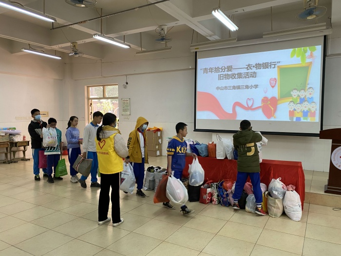 为积极响应中山市少工委倡议,弘扬爱心传播精神,提高垃圾分类、旧物化宝的环保意识、生态意识,引领广大青少年做力所能及的环保行动,1月6日下午,三角小学组织开展“青年拾分爱——衣?物银行”旧物收集活动,为困难人群送上温暖的问候。