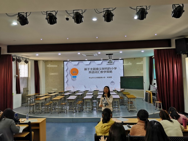 为了让听评课更有针对性,第二环节由三乡镇小学英语学科研究委员会的何旭蓉主任带来一场题为《基于主题意义探究的小学英语词汇教学设计》的讲座。首先,何主任在讲座前对新锐营的学员进行了问卷调查,围绕三个问题与青年教师进行互动:您是如何开展词汇教学的?您是否尝试过依托语篇开展词汇教学?如果有,您是运用什么策略进行的?接着,何主任引用普通高中英语课程标准(2017版)和现场老师们进行探讨主题意义探究的概念内涵。引用程晓堂教授的话:所有语言学习活动都应该是在一定的主题语境下进行的,有效地向老师们传递一个理念:英语教师要具有语篇教学的意识。那怎么依托语篇来开展词汇教学呢?何主任指出可以从三种渠道进行,分别是自创语篇、改编语篇和使用原版语篇。然后深入剖析载德小学英语科组语篇教学的三个案例成果进一步说明语篇补充的原则、目标、策略,让现场老师们对如何通过文本补充践行主题意义探究的词汇教学有了更深刻的理解。