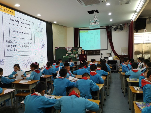 本次活动分为两个部分。第一环节,由载德小学青年教师骆倩盈老师为大家展示一节四年级上册Unit 8 Helping at Home的第二课时。这是一节文本补充视角下的词汇教学, 补充的语篇 选自译林牛津版5B Unit 5 Helping Our Parents故事板块,与本单元Helping at Home的主题吻合。语篇内容讲述了Mike一家周六在家正在做家务的情景。在导入环节,骆老师通过观看视频,利用housework话题展开多角度的联想,激活学生的背景知识,有效地激发学生的学习动机。在呈现和操练环节,通过观察插图、预测文本、观看视频、回答问题、回归语篇、复述故事等一系列的任务让学生用目标语言对故事内容进行预测,逐步理解故事,发散学生的批判性思维,帮助学生再次创造性地使用语言。最后环节的“My Helpful Moment”的拓展活动,更是升华了本课“Helping at Home”这一主题背后的人文性,教师水到渠成地提炼“Share love, share housework”。