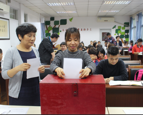 在一片热烈的掌声过后,会议进行《教师年度评优考核综合评价细则》和《期末绩效奖的教学绩效考核方案修订》教职工无记名投票环节,老师们在五个修改提案中认真、谨慎的审阅并履行了自己职责,选出了自己满意的方案投入投票箱。投票结束,工会代表们对投票结果进行了细致的计票。在计票进行的同时,学校民主理财审账小组的成员代表胡雨婵老师做2018年度学校经费审账报告。计票结束,主持人梁丽红老师宣读两个修改方案细则中五条修改意见投票结果为全部通过。会议投票补选了两位民主理财小组成员。最后,学校党支部蔡启民书记做总结讲话。大会在《国际歌》中圆满闭幕。