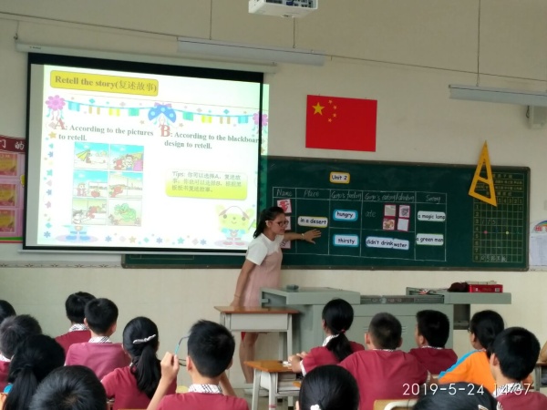 李丽蓉老师上课的内容: Unit 2 A Magic Day。这是Book 6的Story部分。她善于运用故事教学吸引学生的注意力,让学生在轻松愉快中吸收新知。她采用了阅读前、阅读中和阅读后三个环节。阅读前激活学习背景,激发学生学习的兴趣。阅读中,李老师设计一些问题引导学生一步步理解故事。阅读后通过复述故事、role play和设计开放性的问题,引导学生们进行语言输出,提高学生的语用能力。校外导师游佳校长的课堂更是幽默风趣,.她上课的内容是Unit 4 Going outing,这是一节五年级的课。游校长用自己的实际情况创设了一篇语篇,从语篇导入,让学生整体感受英语,后面并以语篇输出。游校长以丰富的肢体语言,有趣的游戏调动学生们学习的积极性,整个课堂气氛积极热烈,学生乐于参与课堂,快乐地学习。?