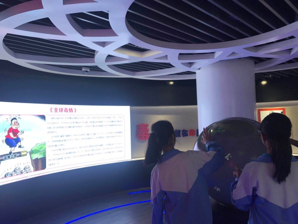 接着,在工作人员李女士的介绍和带领下,学生有序地进入了场馆参观。一进门,就是孙先生的塑像,和关于销烟的事迹,原本有热闹的氛围,一下子变得深沉严肃起来。同学们认真地聆听着导游姐姐的介绍。“这是关于禁烟的主张和人物,都有谁呀?”同学们你一言我一语地回答着。“这是这些就是现在最新型的毒品,这是冰毒、大麻、K粉、摇头丸……等等”同学们听得认真、看得仔细,还不时地发出阵阵感叹:“哇,这个东西要是谁占上了,就要他的命!”