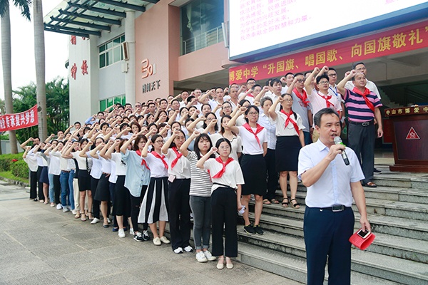 博爱中学的广场上人头攒动,红旗飘飘。在庄严的升国旗、唱国歌、向国旗敬礼中 ,全体师生凝望着徐徐升起的五星红旗,心中充满了对祖国母亲的无限热爱和自豪。