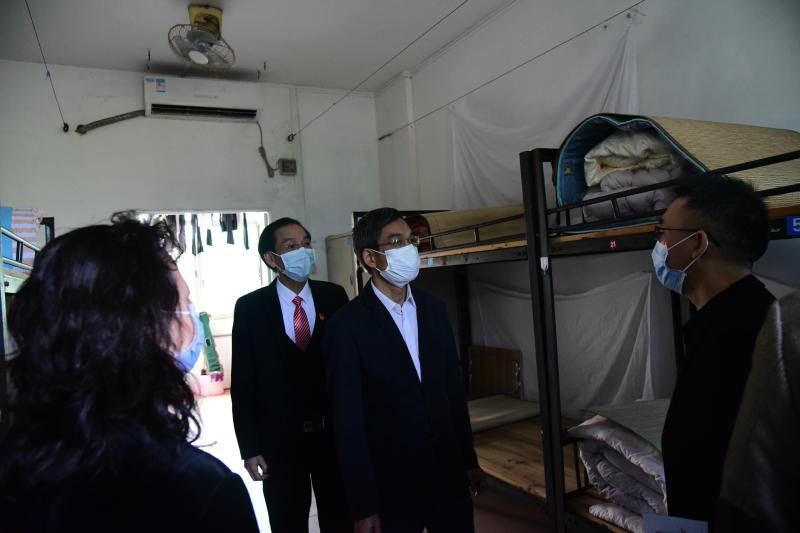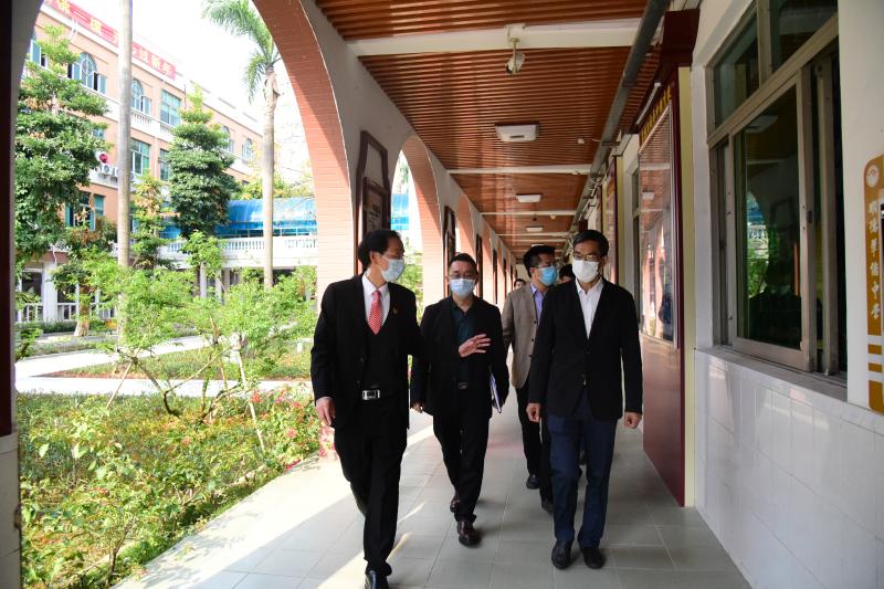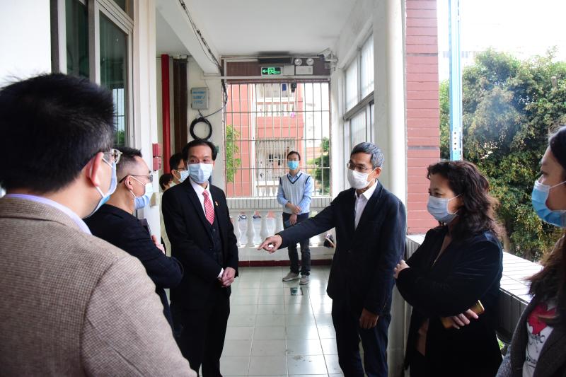 接着,周驭洪副主任一行在吴剑平校长及学校行政的陪同下,深入到教室、校医室、健康观察室、学生宿舍和学生饭堂等功能场室进行视察。