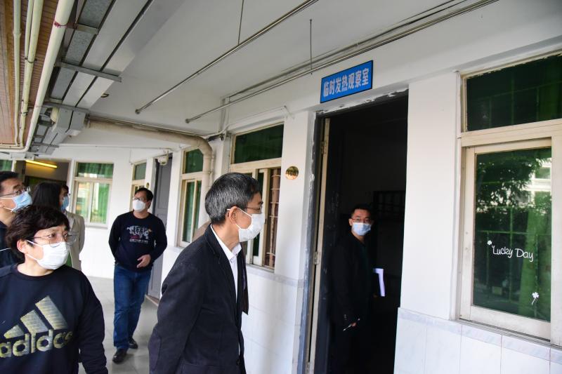 在校医室,周驭洪副主任详细询问了校医室的运作情况以及复学防疫工作预案。认真听取,并记录了我校校医的工作建议。周驭洪副主任对我校校医积极深入思考防疫细节的工作态度表示赞赏,并表示,疫情防控,校医的工作非常重要,务必落实好晨检、午检、晚检制度,严格实施疫情监测和跟踪。
