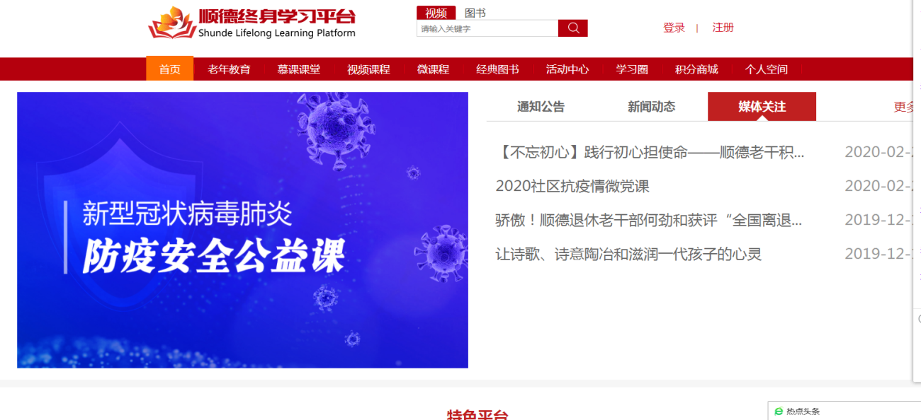 为满足广大社区群众的学习需求,实现我区社区教育信息化、数字化建设目标,在顺德区社区教育工作指导委员会指导下,顺德社区学院充分发挥“全民学习、处处能学、时时可学”“互联网+终身教育”远程开放教育新模式的优势,组织开发全区最大公益性学习平台――“顺德终身学习平台”。该平台于2019年11月2日在顺德区全民终身学习活动周启动仪式上正式发布,经过反复测试和资源的持续充实,近日开始运行,PC端与“学习通”APP同步上线,广大市民将实现不出家门就可享用丰富社区教育资源。