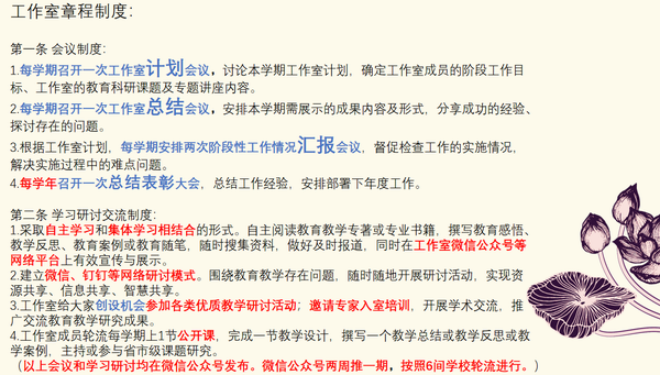 为使名师工作室规范、有效运行,高质量地完成各项目标任务,建设高水准的工作室,4位主持人一起制定了工作室章程和计划。