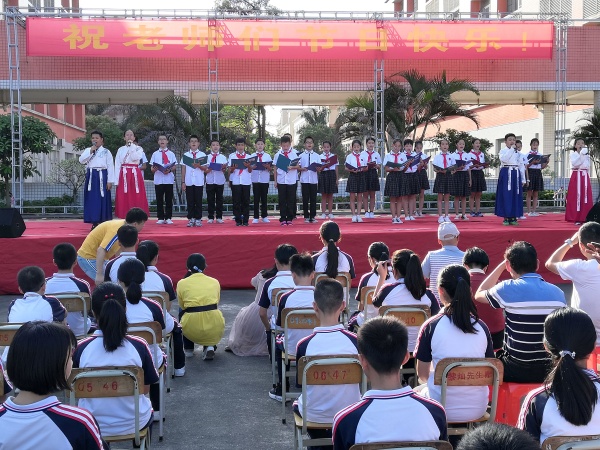 全校两千多名师生整齐地坐在鹤鸣广场,音乐响起,活动在两位学生主持下拉开了活动的序幕。首先,由今年刚步入初中的启美级同学向全体教师朗诵了诗歌《教师礼赞》,声情并茂地演绎着对老师的感恩。台下的观众十分安静地聆听,有些照亮迷,闭上眼睛细细体会其中的感恩之情。第二个表演的是启善级吴锦灏同学为全体师生演绎的笛子独奏《牧笛》,笛声悠扬,婉转动听,博得了广大师生的赞美与鼓励。第三个表演由启真级同学及老师带来的合唱《每当走过老师窗前》,这首歌完美诠释了老师的辛勤,歌声深入人心。