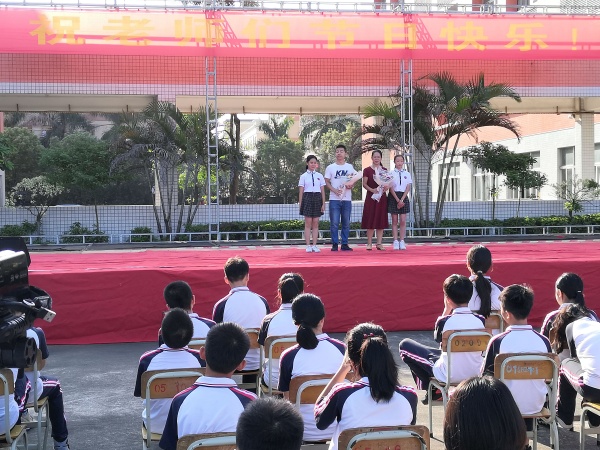 金色九月,秋风送爽,为庆祝第35个教师节,沙溪中学于9月10日早上在校园鹤鸣广场举行教师节庆祝活动。活动由启善级何其俊和林雪怡两位同学的主持,沙溪中学全体师生参加了此次活动。