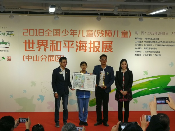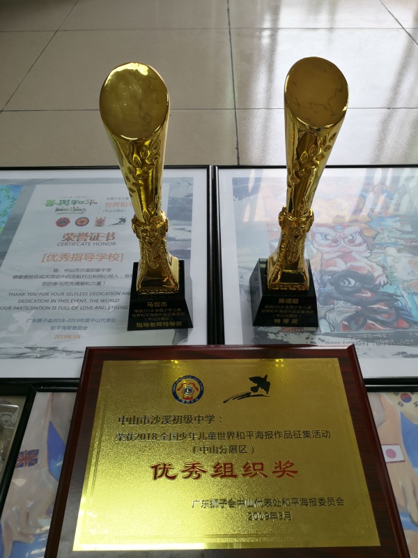 在和平海报中山展区,陈若璇同学作品在上千幅作品中脱颖而出,荣获全市唯一特等奖。沙溪中学荣获优秀组织奖,沙溪中学马世杰、钟亮、罗远美三位老师荣获优秀指导教师奖,莫绍坪、傅天泽等17位学生荣获各类奖项。作品在中山市美术馆展览,接受了中山市电视台、中山日报、沙溪电视台等多家媒体采访。