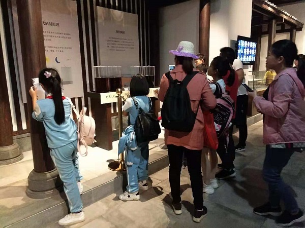 首站前往参观厨邦酱油博物馆。孩子们排着整齐的队伍参观了一楼的售卖柜台、二楼的百酱园、三楼的工艺器具展厅。不同的雕塑还原出制作、售卖的场景,犁、耙、簸箕、风斗、灶台、抽油桶等,让孩子们在欣赏完古香古色的器具中了解到酱油工艺的源远流长。接着观看了厨邦酱油文化科教宣传片、看到了在实验室认真工作研究员和大片的晒场。来到酱油生产线,偌大的生产区只有也只有三五个工作人员,了解到从洗瓶、装瓶、检验、包装,短短的几分钟时间一瓶瓶酱油就生产出来了。孩子们感叹科技的力量。