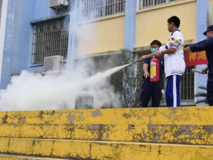 只在台下做观众,不到台上做演员,是很难学到表演技巧的。故此,学校要求初一级部分学生代表、今年刚入职神湾中学的老师及全体校工到演习台,在消防警官的指引下,实战表演灭火器灭火。消防官兵对上台表演的师生非常满意,对他们在极短的时间里掌握灭火技巧大加赞赏。