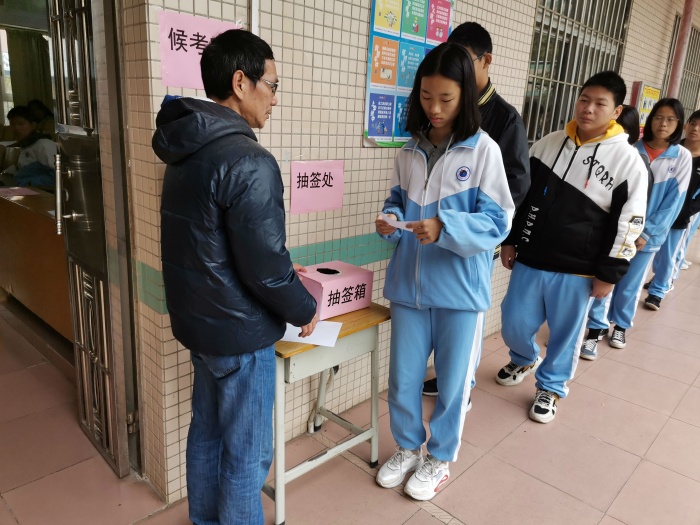 上午8点10分由考务员到班通知第一场学生24人到多媒体准备室抽签,抽签后,学生利用5分钟时间了解实验题操作的要求、步骤、注意事项等。8点15分学生有序地进入操作考核室,8点20分整计时员宣布考核开始,神舟学校六位监考教师收卷当场评分,评分结束后,接着进第下一场学生的操作考核。10点左右,神湾镇教育事务指导中心吴惠欣老师、神湾中学物理老师陈木奇来到神舟学校巡查,监控了初三(2)班的第四场考核过程,包括学生的抽签,学生实验操作和物理教师对学生操作考核打分情况及整体学生的操作考核水平都进行了监督和了解。巡查组对每位监考教师每人监考两位同学操作,考核的学生沉着操作,对实验考核工作表示满意,同时也向学校提出具体的改进建议。