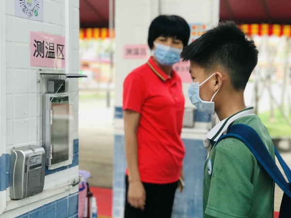 得益于前期返校准备工作的踏实开展、有效落实,尽管半程下起了小雨,但整个返校过程依然顺利而又流畅,完美诠释了刘勰先生的那句“千曲而后晓声,观千剑而后晓器”。中山市教育工委疫情防控党员服务队工作人员李卫政同志在作为路队返校学生入口的东门门口,查看了学校入校测温区的设置、学生进校的监测管理流程等,谭瑞香校长、梁海英副校长用亲切的笑容、温和的语言和得体的手势,迎接学生的到来,指引他们在制定的班级区域排队等候,遵照路面指示保持间距,按要求测量体温,并贴心地为每一位返校学子准备发放了开学礼物:一份校长寄语,包含的是对他们返校的欢迎和期盼;一支糖果,表达的是对他们学习生活的祝福和希望。一句亲切的“欢迎回来”、一个简单的“开学红包礼”,传递了上级领导们的关心和重视,传达出师生期盼已久终于相见的喜悦,学生们也为这真诚的热情所感动、为学校温馨和谐的气氛所感染,一个个脸上展露出腼腆却依然温暖的笑容。见此情景,李卫政同志说道,礼物虽小但情意浓厚,为细心的神小家庭、幸福的神小学子点赞。