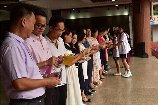随后,全校学生为老师们诵读朗诵词。依次是初三级诗朗诵《致星空体育敬爱的老师》,初二级《奉献,是你的名字》,初一级《九月,属于老师》,最后全体学生合诵感念师恩诵词。整齐而响亮的朗诵声响彻校园,久久回荡。