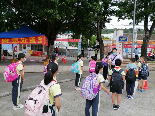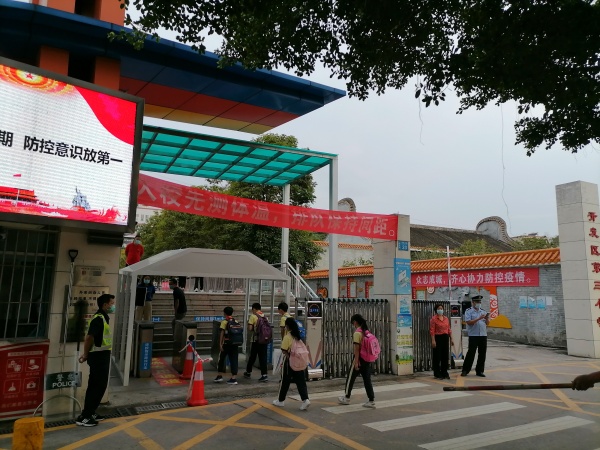三小按照上级要求全力做好疫情防控和返校复课各项工作,精心策划、科学安排、周密组织学生和教职员工返校。当天早上6点多,三小校门口负责检测和维持现场秩序的老师、工作人员已经到岗做准备。7点15分至45分,学生按照学校安排,错峰排队进入校园。每名同学都自觉佩戴了口罩,每个人之间隔了一米以上,没有三三两两聚在一起的现象。老师们则来回巡视,提醒同学们不要随意摘口罩、相隔远一点。