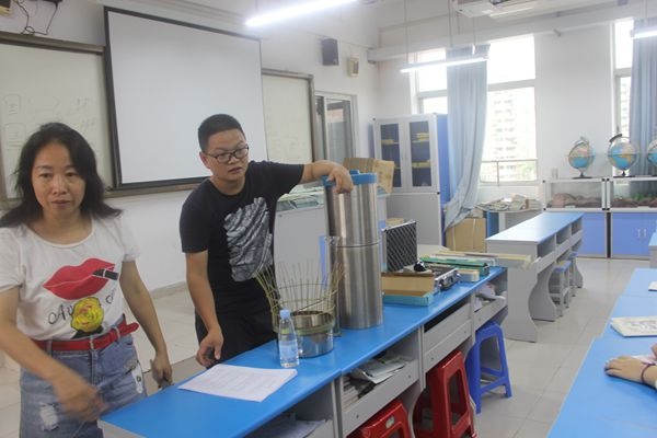 两位气象员下午两点多到达学校观测点,为气象观测站更新旧设备。由于旧的仪器设备多为玻璃制品,经受长期曝晒雨淋,容易受损,中山市气象局工作人员在三天前送仪器时看到了这些,决定无偿提供更好的设备,特意送给学校雨量筒,浅层地温,量杯,干湿球温度等一批器材,撤除了易生锈的锌铁质雨量筒等旧设备,安装了不锈钢的新设备,为地理气象观测站的同学们提供优质测量用具。