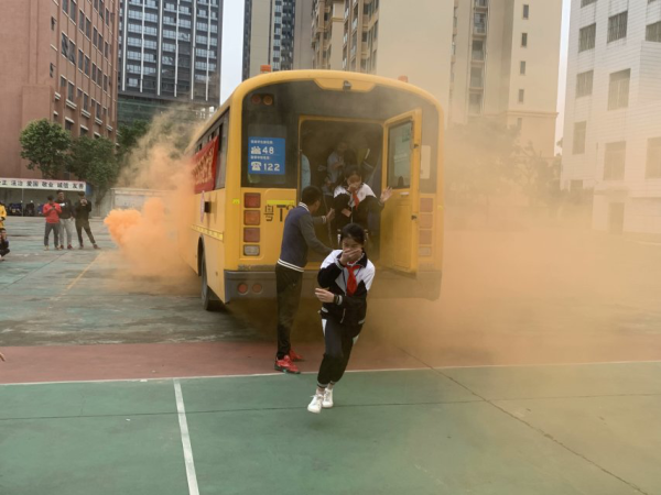 全体师生集合后,俞希金老师从校车危险产生的原因和危害性讲解了校车安全应急逃生演练的重要性和必要性。并就应对校车突发事故的逃生知识、方法和实际操作要领做了讲解。并进行校车突发事故逃生演练:演练校车在行驶过程中突然起火,车内、车外浓烟滚滚,校车驾驶员熄灭油门,打开车门,跟车教师组织车上的学生捂住口鼻,有序跑向安全地带,成功疏散集中后,由跟车教师清点人数。