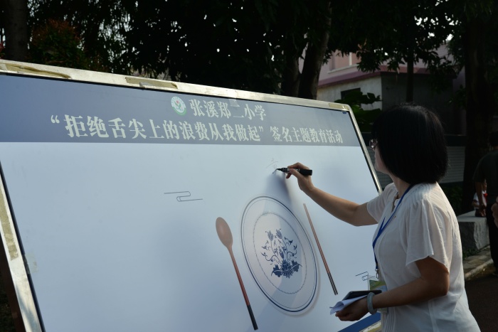 为积极响应党中央的号召,拒绝舌尖上的浪费,传承舌尖上的美德,学校德育处王太能主任带领全体学生宣誓,宣誓结束后,戴织校长带领教师代表和学生代表在“拒绝舌尖上的浪费从我做起”宣传板上签名,张溪学子争做“光盘行动”的践行者,争做节约粮食的倡导者、行动者。
