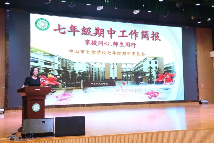 初中部家长会分别在演艺厅和教室开展,七年级级组长寇璐老师以“家校同心,师生同行”为主题面向七年级家长们做了精彩的级组教育教学工作汇报。寇老师首先以校园视频剪影向家长们展示开学以来学校丰富多彩的校园活动,充分展现了大信学校初中部坚持德育引领,活动育人的办学理念。紧接着寇老师从学校作息制度、精细化管理、德智体美劳全面发展、与兄弟学校进行交流学习等方面展现了学校在教育教学工作中取得的成效,让家长们更全面地了解学校的办学情况,进一步增强了家校之间的沟通与联系。