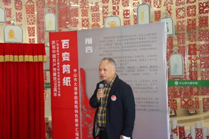 百年风雨、百年历程。2021年是中国共产党建党100周年,为了促进中山市大信学校学生的全面发展,构建高质量、高水平的素质教育实施体系,更好地实现“学校有特色,教师有专长,学生有特长”,大信学校美术教育开展了特色建设的研究与实践,培养学生发现美、表现美、创造美的美好情趣,进一步以艺术手段发展学生个性特长,提升孩子们的艺术素养,特此举办中山市大信学校“广东省民间工艺美术特色学校”揭牌仪式暨“百变剪纸”特色汇报展。