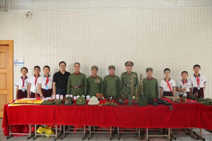 国防军事训练不仅要训练身体,更要强化爱国思想!10月10日下午,大信学校迎来了对越自卫还击战老兵,他们向七年级学生们展示了在革命战争中使用到的电报机、冲锋枪子弹夹、迫击炮弹、防毒面具等武器装备。中山市最美退役军人李克爷爷分享了他的参军故事以及退役后致力于公益事业的事迹,同学们听得津津有味,热血沸腾。