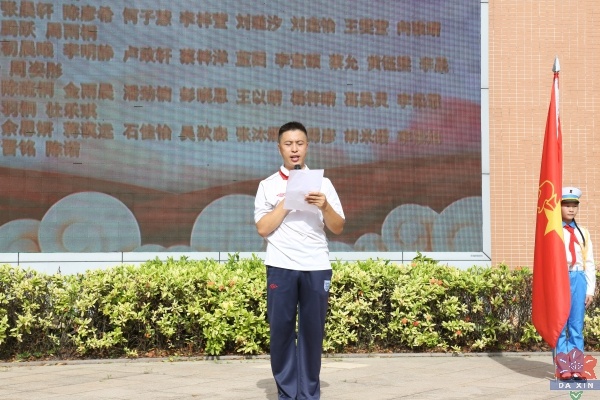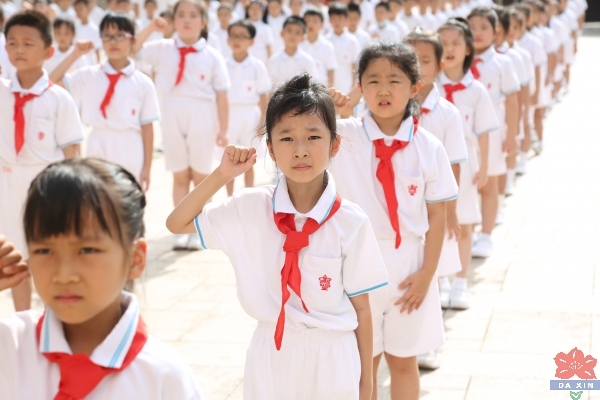 艳阳高照的六月热情似火,石岐中心小学大新学校校园内队歌嘹亮,全体校领导和一年级师生在升旗广场上为104名2019级一年级学生隆重开展了第一批新队员入队仪式。孩子们身着整齐的校服,脸上洋溢着灿烂的笑容,他们期盼已久的时刻终于来临了——加入光荣的少先队组织。
