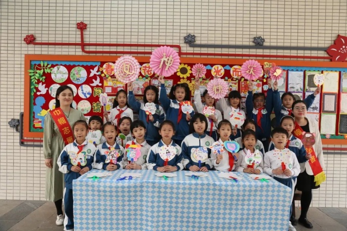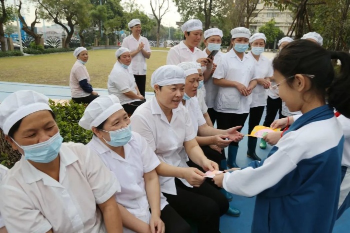 瞧!低年级的小可爱们,拿着自己亲手制作的爱心手工作品送给了平日里辛苦工作的老师和员工阿姨。
