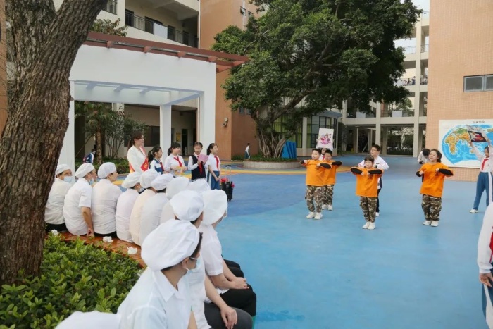 中年级的孩子们为星空体育的饮食健康尽心尽力的阿姨们献上了一段欢快的街舞表演,从阿姨们的笑容和掌声中感受到了此刻她们的轻松愉悦。