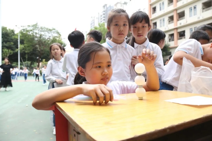 科技大游园活动涵盖了物理、生物、数学、科学、信息五大学科。小学数学有数学趣题、鲁班锁拼装、24点、数独游戏等;小学信息有触控交互体验、编码游戏、AI体验项目;小学科学有纸飞机穿环、辉光球体验、乒乓球叠高、遥控赛车体验、电路大冲关、手势四轴体验、显微镜等。初中数学开展了智取火柴棒,猜年龄,抓堆堆等活动,让学生感受到数学与博弈论之间的联系,激发数学学习热情。物理科组的项目丰富多样,有心形电动机,自制电磁小火车,反重力圆筒,抽水小专家,竹签串串球,吸管穿土豆,跳水冠军,让学生领悟物理之美,生活处处皆物理。生物学科开展了套取指纹,生物知识小竞赛,体验显微镜大世界,展示人体模型,感受人体的奥秘。地理学科给学生展示了土壤标本和望远镜,让大家了解不同的地质文化和望远镜的构造。化学学科有自制酸碱指示剂,变色反应,隐形墨水,学生通过所学的化学知识解答生活中的魔术变色。
