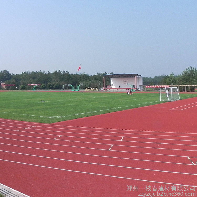 4、混合型塑胶跑道是PU与黑色橡胶颗粒按一定比例混合而成跑道系统。材料运到现场按一定比例混合,加入催化剂搅拌均匀,摊铺,常温硫化成型,该面层是现时有标准的塑胶面层材料,主要用于专业比赛用场地等。
