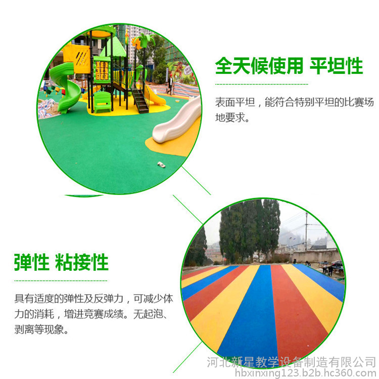 EPDM具有卓越的耐环境老化、耐热老化性、耐臭氧性、耐化学介质性、耐水性和耐低温性,并且有良好的电绝缘性和弹性,以及优异的色彩稳定性,制品颜色经久不变。 是由表层EPDM彩色橡胶层与黑色橡胶缓冲层组成,各种颜色可搭配,可随意铺不同的颜色或单种颜色,特别适合于幼儿园,满足幼儿心理特点,还可直接铺在混凝土面层上,与传统的聚胺酯跑道相比可节省大量地基成本。