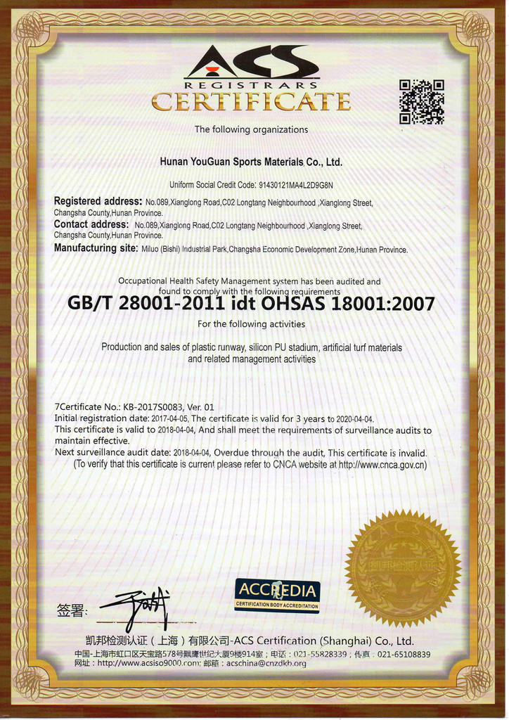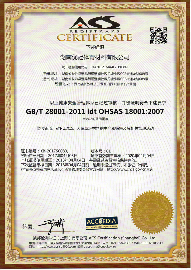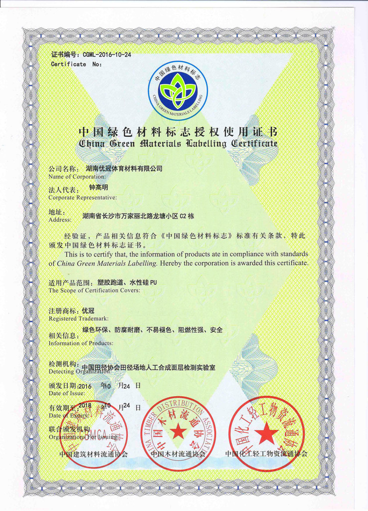 优冠实业集团有限公司(以下简称集团)是一家专业从事运动场地材料,人造草坪研发、生产、销售、铺装的科技创新型企业,是湖南省地方标准DB43/ T1252-2017《学校合成材料运动场地面层质量安全通用规范》主要起草单位之一。公司具备国际田联(IAAF)认证、国际网联(ITF)认证、中国环境标志产品认证、中国绿色材料标志授权使用证书、企业生产环评批复报告、安全生产标准化三级企业证书、对外贸易经营者备案登记表等,并成为湖南省政府采购协会会员。集团下辖湖南优冠体育材料有限公司、五舟体育设备制造有限公司、湖南康普斯人造草坪有限公司、湖南科迪环保科技有限公司、湖南优冠运动场铺装技术服务有限公司、湖南优冠塑胶体育工程有限公司。