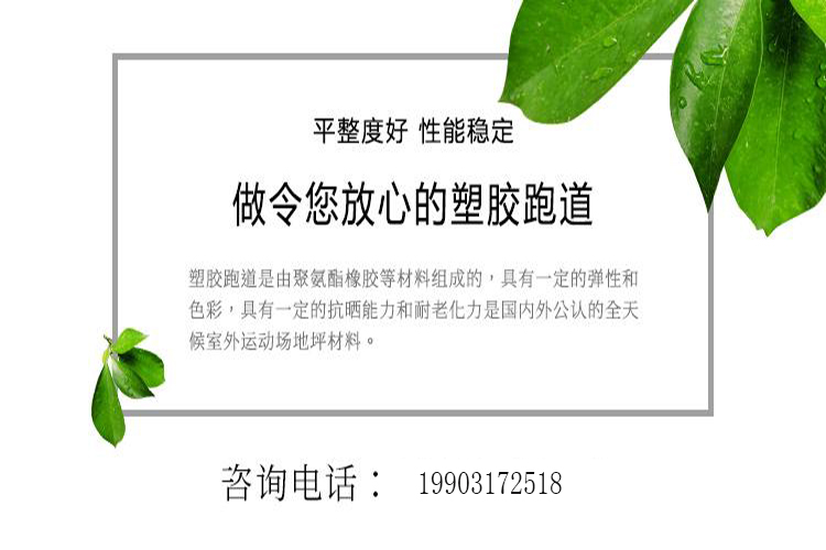 环保性:采用新型环保原料,不危害使用者健康;在材料配方上依据不同地区阳光紫外线的数据来调整使用紫外线吸收剂及抗氧剂等,能有效延缓老化;不易脱粒、开裂、起泡,从而极少产生影响环境卫生的塑胶颗粒;耐摩擦、耐酸碱、耐老化,使用寿命长。2、安全性:根据不同场地的要求,调整材料的厚度、弹性和摩擦系数,以适合不同运动对安全的要求;弹性适度、防滑性好,能有效保护运动员的韧带、肌肉、皮肤,以防拉伤或擦伤;适度的缓冲性可适度地吸收脚步的冲击力,减少运动伤害。3、有效性:材料的各种系数的可调节性便于针对不同运动特性的场地使用能提高运动效率的材料;通过使用透气、透水的材料和相应的施工工艺,可满足场地的全天候使用的要求,即使大雨刚过,也可立即投入使用;适度的弹性可减少体力消耗,从而可增加训练时间或增进竞赛成绩;较强的抗钉力和耐压缩性可将钉鞋、体育器械对场地的破坏减至少,使场地保持一贯的有效性;专业的施工和使用自流平材料,可使表面更平坦,从而更有效地训练和比赛;美观的外观和颜色搭配,在心理上对运动效率有积极作用。产品外观:水白色或微黄色澄清透明液体