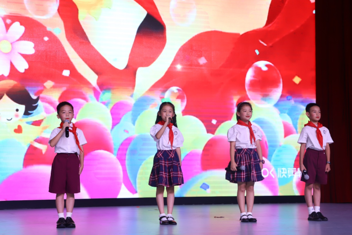 随后,一5中队黄政浩、二1中队管晨羽、二6中队李宥汐、三9中队谢泽辰4位少先队代表深情地朗诵了诗歌《心中的红领巾》,一5中队蓝天晴队员用甜美的歌声诵唱了一首《南湖的小木船》,表达了新时代少先队员高举队旗跟党走,立志成长为社会主义合格建设者和接班人的信心和决心。最后,少先队总辅导员罗嘉立老师的领誓和呼号下,全体新队员表现出了“准备着,为共产主义事业而奋斗”的决心。