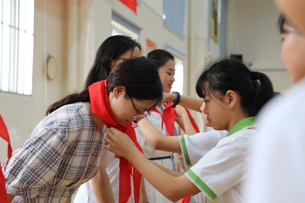 8点40分,学校篮球馆内热闹非凡,简单而隆重的 “红领巾心向党 争做新时代好少年”暨一年级新队员入队仪式在这里举行。仪式由六(2)中队的幸子越同学主持。活动伊始,伴随《出旗曲》,旗手们精神抖擞,迈着正步、高擎队旗步入会场,出旗仪式拉开了活动的序幕。随后,大队长王敏乔宣读一年级被批准加入中国少年先锋队队员名单,祝贺他们成为光荣的少先队员。随着《红旗飘起来》音乐响起,六年级队员为一年级新队员佩戴红领巾,随即新老少先队员互敬队礼。接着,少先队大队辅导员杜沁源老师为各中队授旗,队员代表为各中队辅导员戴上鲜艳的红领巾,全体队员共同高唱《中国少年先锋队队歌》,嘹亮的歌声展示了队员们坚毅的信心和无比自豪的情感。最后,杜沁源老师带领队员呼号。