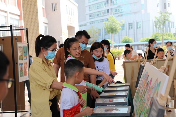 与此同时,该校校庆主题书画作品在大堂同步展出。据悉,本次书画展早在上学期就已开始策划、筹备,从学校的特色教育出发,美术科组的老师们带领社团的孩子们精心准备,展出了版画、水彩画、书法、雕刻等形式各样的作品,现场“圈粉”无数,有的驻足在学生的书法作品前,啧啧称奇;有的流连于版画作品中,细细品味;有的拿起了手机,留下一份份精彩的记忆。