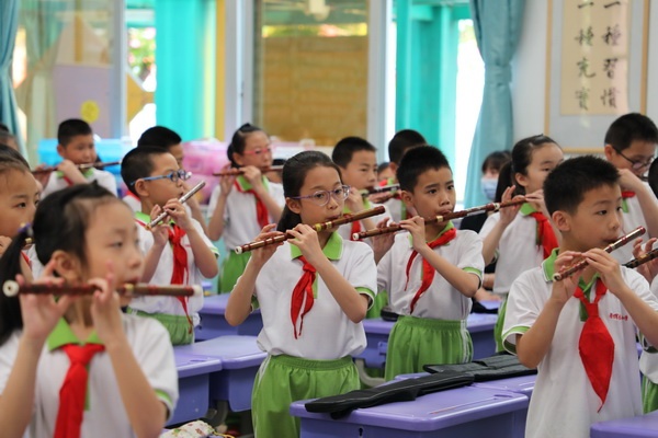 清晨的校园里随处可见忙碌的身影,竹笛社团的孩子们在学校西门吹奏《青花瓷》《我爱你中国》《童年》等曲目,用优美旋律迎接各方来宾;南门名人园里,在钟远良老师的电子琴伴奏下,六2班袁鸿林、六5班刘馨瑜等几位优秀竹笛学生代表轮番演奏《牧民新歌》《姑苏行》等经典曲目;东门童趣园里,六6班全体学生吹响《每当我走过老师窗前》《红星歌》等耳熟能详的歌曲。