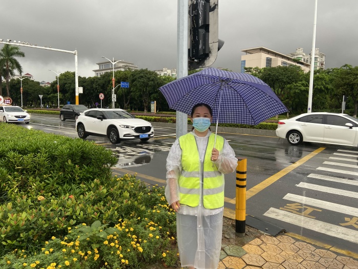 早上7点20分,开发区第一小学的教师志愿者们就来到世纪一路十字路口,教师志愿者穿着统一的志愿者服,佩戴口罩,尽管受台风“查帕卡”的影响,仍阻止不了教师志愿者的行动,她们冒雨坚守岗位,与交警们一起在各个主要路口,指挥着出行的市民安全有序的过马路。在劝导过程中,非机动车不按车道行驶、越过停止线、未佩戴头盔、超载等不文明行为,在志愿者劝导下路口渐渐整齐有序。她们还为行人做指引,保证行人能安全过马路。